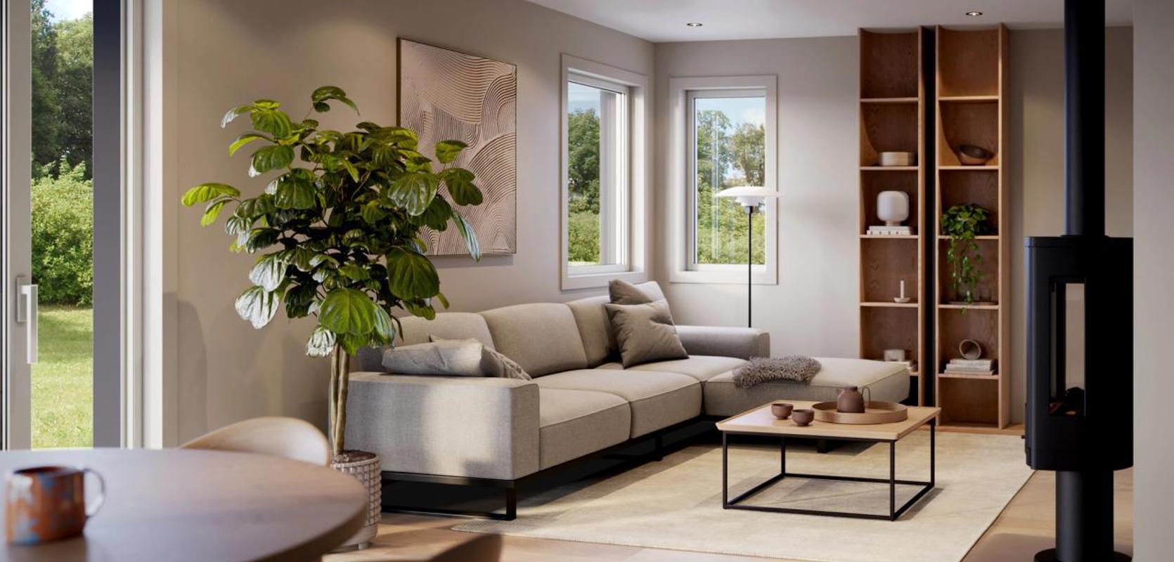 Oppholdsrommet er luftig og innbydende, med soner som gjør det enkelt å kombinere avslapning og sosiale sammenkomster. Store vinduer sørger for rikelig med naturlig lys, og gir en herlig forbindelse mellom inne- og uterom. Den overbygde terrassen og balkongen inviterer til hyggelige sommerkvelder med familie og venner, hvor du virkelig kan nyte omgivelsene.